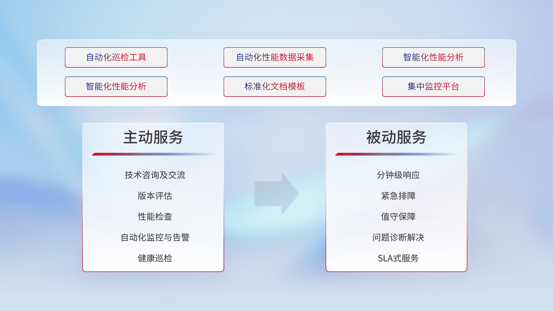 智能化工具和标准化文档,,,,保障服务质量,,,提供主动服务(包含技术咨询、、、、版本评估、、性能检查、、、、自动化监控与告警、、、、健康巡检)和被动服务包含(分钟级响应、、紧急排障、、、值守保障、、、问题诊断解决、、SLA服务)。。。。
